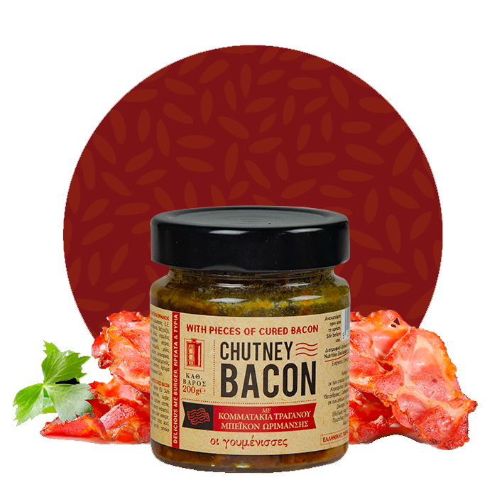 Με κομματάκια τραγανού μπέικον ωρίμανσης, αυτή η «μαρμελάδα» θα σας συναρπάσει! Μοναδική στη χώρα μας με σφραγίδα ελληνικής παραγωγής, απολαύστε την με πικάντικα ή αλοιφώδη τυριά, burger, λουκάνικα και κάθε είδους ψητά κρεατικά, αβγά scrambled, με πατάτες τηγανιτές, σε σάντουιτς και κάθε είδους μαγειρικές δημιουργίες.