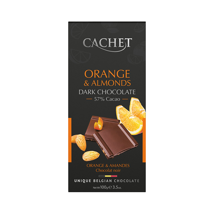 Σοκολάτα Μαύρη 57% Κακάο με Αμύγδαλο & Πορτοκάλι Cachet 100gr